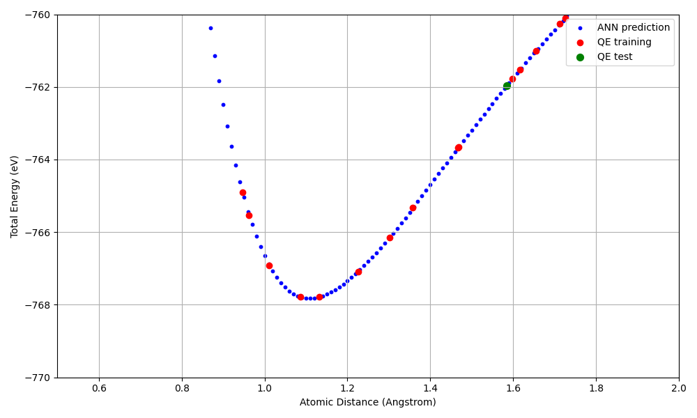 ANN prediction (blue): Interatomic distance vs. energy from