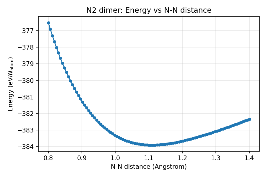 グリッド探索の結果、エネルギーが最小となる N-N 結合距離が約 1.1 Å であることがわかります。